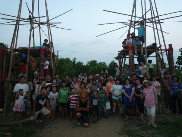 貝童年廣場進行的神奇樹屋營,連續五天在烈日當中進行,如果你親臨現場看到師生們熱情努力地建造,將大大的感動,我們像鬥志高昂的攻城戰士,經過五天的纏鬥終於將四座神奇的樹屋神奇地完成了,樹屋的平台非常堅固,老師孩子們都非常興奮,事實上第四天傍晚孩子們就已經開在樹屋的平台上享受夕陽彩霞輝映中的晚餐滋味,真是讚啊